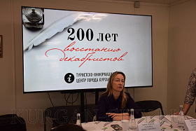 Приветствовала участников заведующая отделом культуры департамента социальной политики администрации города Кургана Татьяна Абросимова, подчеркнувшая, что сегодняшняя встреча проводится накануне юбилея восстания декабристов. «Тема 200-летия восстания декабристов важная для Кургана, это наша гордость. Каждый из вас в своем направлении заинтересован юбилейной темой. Ждем новых идей и предложений, которые в будущем воплотятся в жизнь», - обратилась Татьяна Вячеславовна.