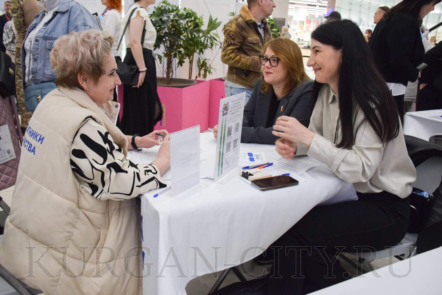 К площадке администрации города Кургана подходило немало соискателей. Здесь граждане получали консультации начальника управления муниципальной службы кадров и профилактики коррупционных правонарушений аппарата администрации города Юлии Назаровой и её заместителя Яны Старостиной. Горожане обращались по направлениям юридического сопровождения, искали работу бухгалтера, водителя. Мама студентки последнего курса колледжа уточняла, может ли её дочь трудоустроиться в администрацию города. Юлия Назарова разъяснила, что в администрации города студенты могут пройти стажировку с последующим трудоустройством после окончания учебы.
